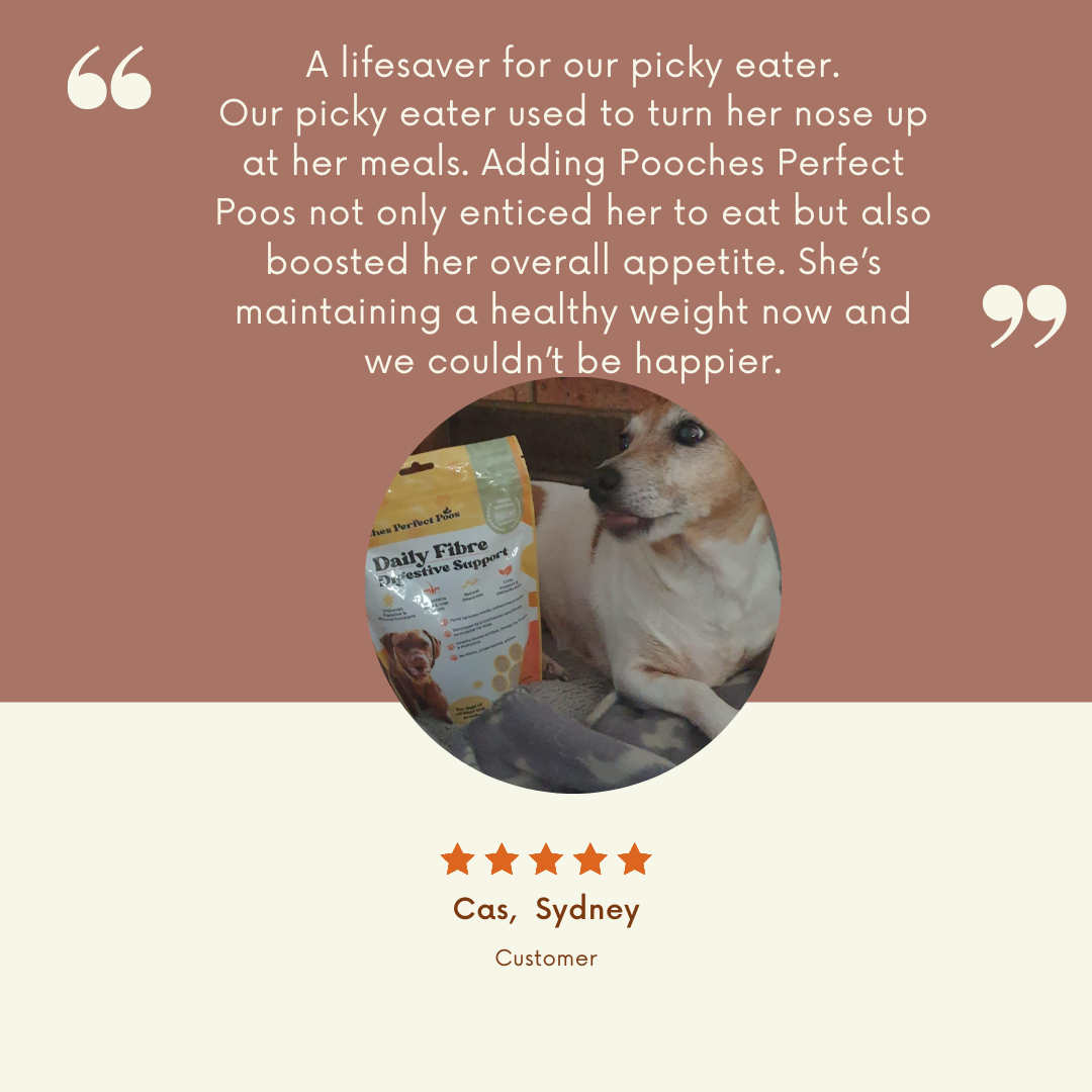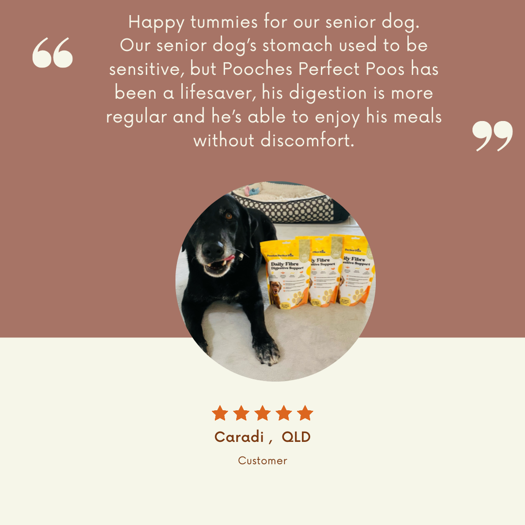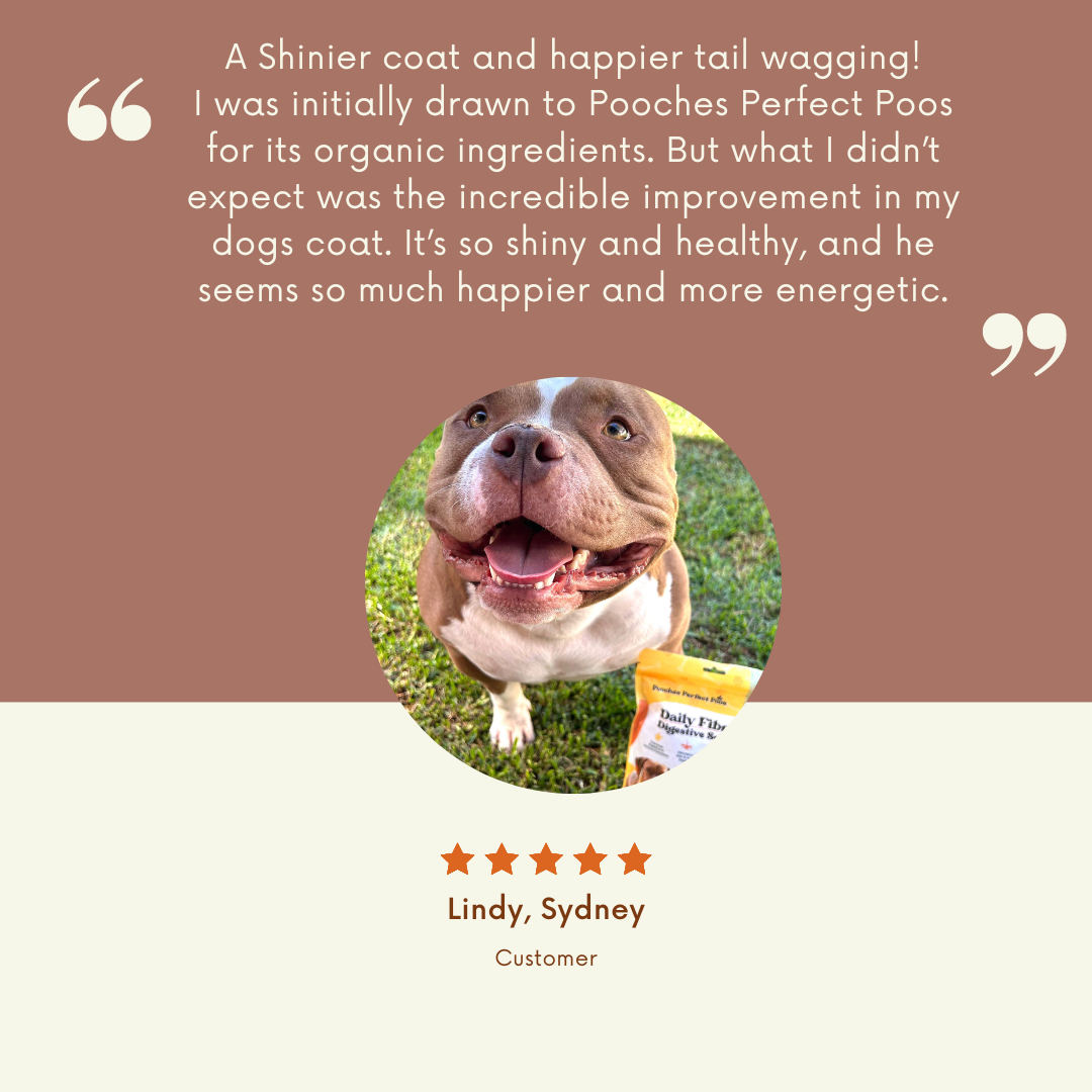 "I was skeptical at first, but after just a few weeks of using Pooches Perfect Poos, the difference was incredible. Cleanup is now a breeze!" - Lindy R